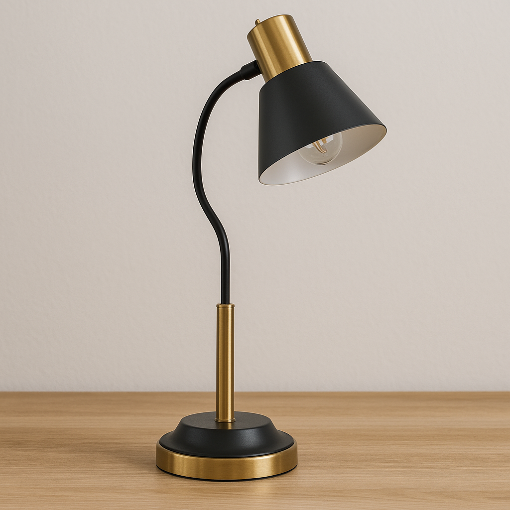 La base circular de 18 cm de diámetro proporciona estabilidad, mientras que su brazo flexible permite orientar la luz según las necesidades del usuario. La pantalla cónica de 12 cm de ancho en acabado negro dirige la iluminación de forma precisa, ideal para escritorios, mesas de noche o rincones de lectura.