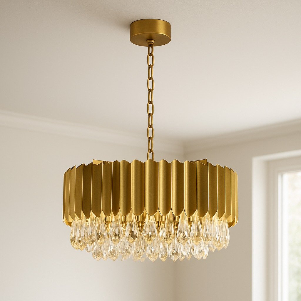 Su diseño combina líneas verticales limpias con materiales nobles, ideal para interiores de estilo contemporáneo, clásico renovado o art déco. Gracias a sus 8 luces E14, proporciona una iluminación envolvente, perfecta para salas, comedores y vestíbulos donde se busca elegancia y calidez.