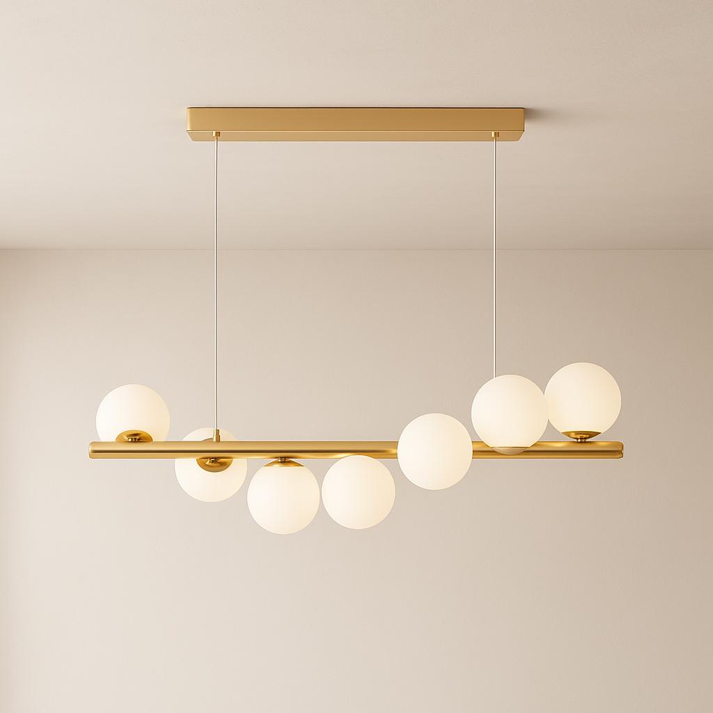 Línea Boreal es una luminaria de techo que encarna el equilibrio entre arte moderno y funcionalidad. Su estructura horizontal en acabado dorado brillante sostiene elegantes esferas de vidrio opalino, dispuestas en una composición armoniosa que evoca la serenidad de las auroras nórdicas. Con un largo de 72 cm y un alto graduable entre 60 y 15 cm, se adapta a distintos espacios, desde comedores y barras hasta estudios contemporáneos. Esta pieza destaca no solo por su presencia escultórica, sino también por la calidez de su luz difusa, ideal para ambientes sofisticados y minimalistas. Línea Boreal es más que una lámpara: es una declaración de estilo.